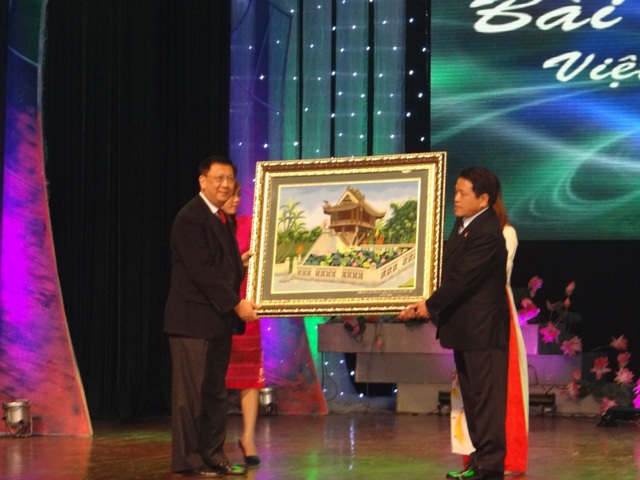 | นายกสมาคมมิตรภาพเวียดนาม-ไทยกรุงฮานอยมอบ ภาพอัญมณีวัดเสาเดียวแ่ด่ท่านเอนุสนธิ์ ชินวรรณโณอกอัครราชทูตไทยประจำเวียดนาม |
