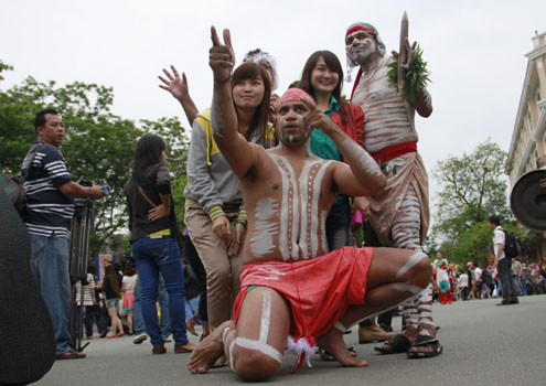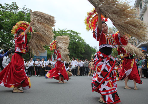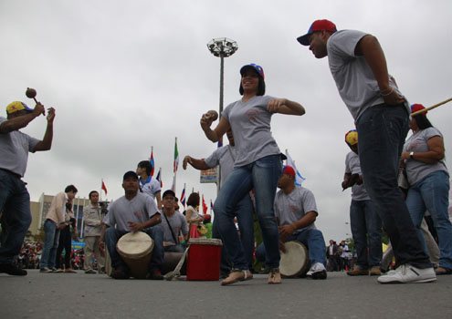 | กลุ่มดนตรีพื้นเมือง Tambores de San Millan จากประเทศเวเนซูเอลาได้สร้างความประทับใจให้แก่ทุกคนเมื่อนำเสียงกลองพร้อม การระบำรำฟ้อนที่ครึกครื้นแปลกใหม่มาแนะนำให้ชาวเว้และมิตรประเทศได้รับชม |