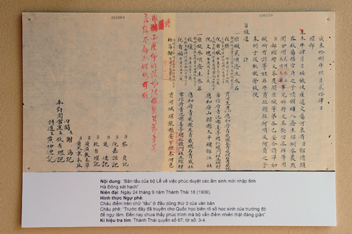| ปัจจุบัน ศูนย์จดหมายเหตุแห่งชาติหมายเลข๑กำลังเก็บรักษาพระบรมราชโองการโปรดเกล้าฯในสมัยราชวงศ์เหงียนประมาณ๗ร้อยฉบับ |
