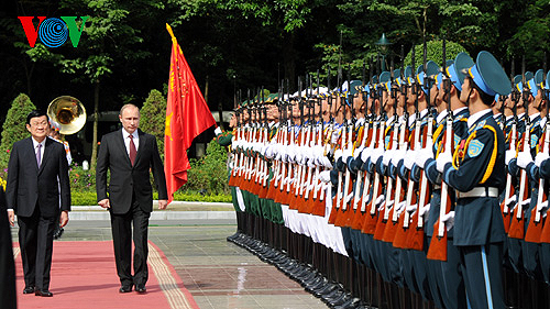 | ประธานประเทศเวียดนามเจืองเติ๊นซางและประธานาธิบดีรัสเซียวลาดีเมียร์ ปูติน ตรวจแถวทหารกองเกียรติยศ |