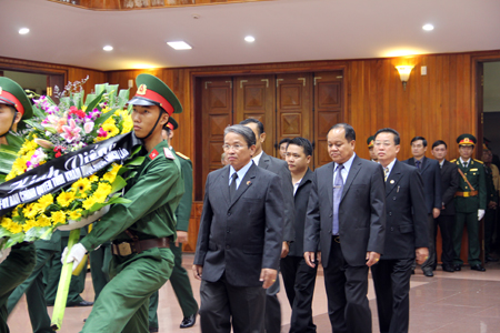 | คณะผู้แทนของแขวงคำม่วนประเทศลาวได้เดินทางถึงจังหวัดด่งเหยเพื่อเข้าพิธีไว้อาลัยพลเอกหวอเงียนย๊าป |