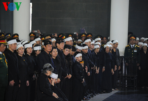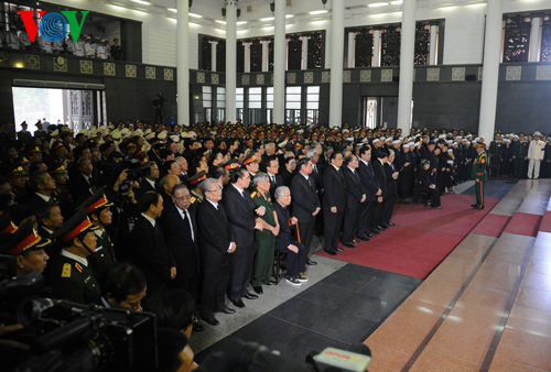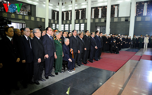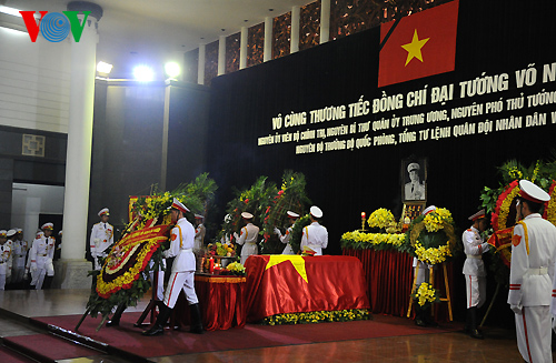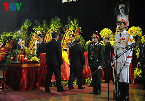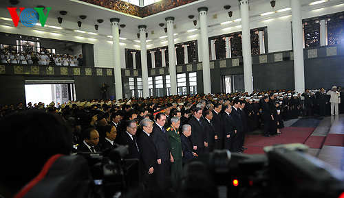 | บรรดาผู้นำและอดีตผู้นำพรรค รัฐ รัฐสภา รัฐบาล กองทัพ และคณะผู้แทนคณะทูตานุทูต กระทรวงหน่วยงานส่วนกลาง องค์การมวลชนและตัวแทนท้องถิ่นต่างๆพร้อมครอบครัวของท่านพลเอกหวอเงวียนย้าปได้ยืนไว้อาลัยท่านพลเอกเป็นเวลา1นาที |