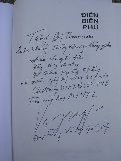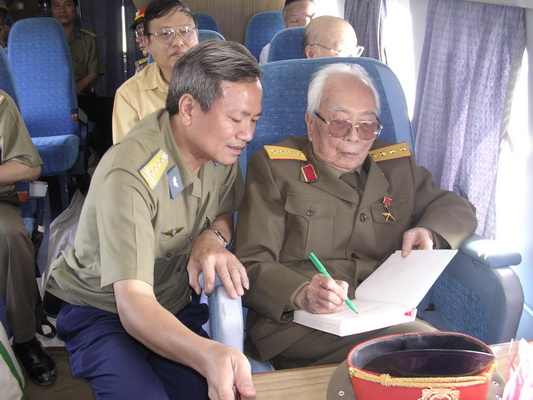 | พลเอก Võ Nguyên Giáp เซ็นชื่อในหนังสือ "ความทรงจำแห่งเดียนเบียนฟู"เพื่อมอบให้แก่เหล่าทหารต่อสู้อากาศยานเวียดนามในโอกาสรำลึกครบรอบ 50 ปีชัยชนะเดียนเบียนฟู |