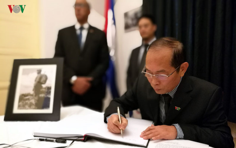 ![]() ท่าน ฝามบิ่งมิง รองนายกรัฐมนตรีและรัฐมนตรีว่าการกระทรวงการต่างประเทศเวียดนามลงนามในสมุดไว้อาลัย