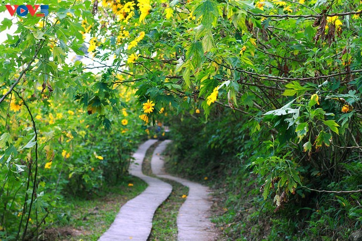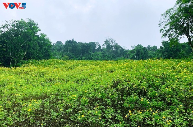 เนินเขาในอุทยานแห่งชาติ บาหวี่ที่ถูกปกคลุมด้วยดอกทานตะวันนั้น เปรียบเสมือนนาข้าวสุกเหลืองอร่ามใต้แสงแดดฝนช่วงฤดูใบไม้ร่วง (ภาพจาก mia.vn) |