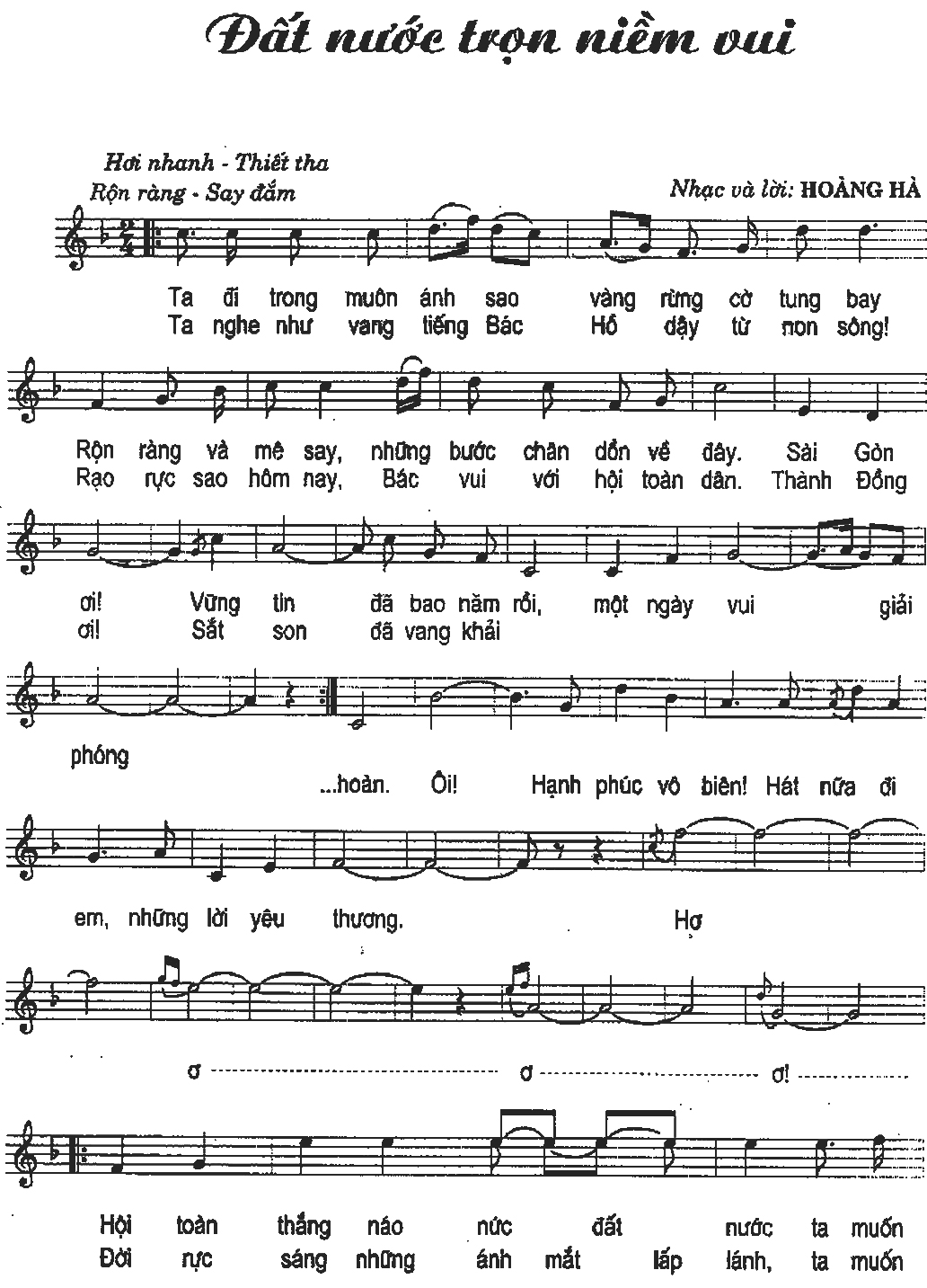 “Đất nước trọn niềm vui” หรือแปลว่า “ประเทศแห่งความสุข”ของนักดนตรี หว่างห่า ผู้ล่วงลับเป็นหนึ่งในเพลงที่ไพเราะฯเกี่ยวกับวันปลดปล่อยภาคใต้ 30 เมษายน นักดนตรี หว่างห่า ผู้ล่วงลับได้แต่งเพลงนี้เมื่อคืนวันที่ 26 เมษายนปี 1975 ที่บ้านพักในกรุงฮานอย ซึ่งเพลงนี้คือความในใจและ ความสุขของนักดนตรีเมื่อประเทศได้รับการปลดปล่อย ศิลปิน จุงเกียน เป็นนักร้องคนแรกที่ร้องเพลงนี้ โดยเนื้อร้องมีตอนหนึ่งว่า “ผมเดินบนถนนที่เต็มไปด้วยธงดาวเหลือง” เพลง“Đất nước trọn niềm vui” และเพลง “Như có Bác Hồ trong ngày vui đại thắng” หรือแปลว่า “ดังที่มีลุงโฮในวันมหาชัย”ของนักดนตรี ฝามเตวียน ได้รับการออกอากาศผ่านสถานีวิทยุปลดปล่อยเป็นครั้งแรกเมื่อเช้าวันที่ 1 พฤษภาคมปี 1975 นักดนตรี หว่างห่า ผู้ล่วงลับได้ใช้เวลาแค่ 1 วันเพื่อแต่งเพลงนี้ นี่เป็นผลงานกระบวนการเคลื่อนไหวการปฏิวัติและดนตรีของเขา นาย เหงวียนถวีคา นักวิจัยด้านดนตรีได้เผยว่า “ นักดนตรี หว่างห่า ผู้ล่วงลับได้แต่งเพลง “Đất nước trọn niềm vui” หรือแปว่า “ประเทศแห่งความสุข”ก่อนวันที่ 30 เมษายนปี 1975 โดยแต่งในแนวดนตรีเชมเบอร์และแนวคลาสสิค ภายหลังวันที่ 30 เมษายน บนเพลงนี้ได้ถูกเผยแพร่ในภาคใต้และเยาวชนในภาคใต้เวียดนามในตอนนั้นต่างร้องเพลงนี้”