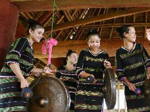 | สาวชนเผ่าบรรเลงฆ้องและรำในโอกาสเปิดบ้านโรงใหม่( อินเตอร์เน็ต ) |