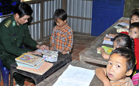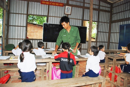 ชั้นเรียนนี้ได้รับการจัดตั้งเมื่อกว่า๑๐ปีก่อนโดยตอนแรกผู้บังคับบัญชาและทหารหน่วยทหาร๘๐๔ต้องเดินทางไปยังแต่ละครอบครัวเพื่อรณรงค์ผู้ปกปครองให้เด็กไปเรียน ส่วนใหญ่ประชาชนบนเกาะต้องหาเลียงชีพไกลบ้าน ดังนั้นการชัดชวนให้เด็กๆไปเรียนก็ยากอยู่แล้ว การส่งเสริมให้เด็กไปโรงเรียนทุกวันกลับยิ่งยากกว่า ร้อยโทTrần Bình Phụcซึ่งเป็นครูประจำชั้นเผยว่า บางทีต้องเดินทางไปยังบ้านของเด็กๆเพื่อพาพวกเขาไปเรียนด้วยตนเองโดยต้องจับมือเด็กโต และให้เด็กเล็กขี่หลัง ชีวิตความเป็นอยู่ของผู้ปกครองก็เต็มไปด้วยความยากลำบากแล้ว ดังนั้น พวกเราจึงพยายามสอนให้เด็กๆรู้หนังสือ การศึกษาที่นี่ไม่เหมือนแผ่นดินใหญ่ ไม่หยุดหน้าร้อนหรือหยุดในวันงานสำคัญ เด็กๆจะหยุดเรียนก็ต่อเมื่อครูไปธุระเท่านั้น ร้อยโทTrần Bình Phục เผยว่า“ผมไม่เคยเรียนมหาวิทยาลัยครุศาสตร์ แต่ผมสอนเด็กๆด้วยความรักและศึกษาเทคนิคการสอนจากหนังสือตำราเรียนที่เพื่อนๆจากแผ่นดินใหญ่ส่งมาให้ ผมใช้วิธีการสอนที่ง่ายๆเพื่อให้เด็กๆเข้าใจง่ายและจำได้นาน ปัจจุบัน ผมสอนวิชาวรรณกรรม คณิตศาสตร์ ประวัติศาสตร์ ภูมิศาสตร์ วิทยาศาสตร์ ผมสอนตอนเช้า พอตกบ่ายก็ทำหน้าที่ของทหาร ในเวลาข้างหน้าผมจะสอนเด็กเพิ่มอีก๑วิชา” แม้หน้าที่หลักที่รัดตัวอยู่แล้ว แต่จากความรักเด็กๆ ร้อยโทTrần Bình Phục ยังคงเตรียมการสอนเป็นอย่างดีและหมั่นเพิ่มพูนความรู้เกี่ยวกับวิธีสอนอย่างต่อเนื่องนอกจากนี้ เขายังรณรงค์ให้เพื่อนมิตรจากแผ่นดินใหญ่บริจาคหนังสือตำราเรียน สมุด อุปกรณ์การเรียนและเสื้อผ้าเพื่อให้ความช่วยเหลือแก่เด็กๆอีกด้วย ร้อยโทTrần Bình Phục เป็นครูประจำชั้นได้๓ปีแล้ว ทุกเช้าเขาจะลงเขาไปเพื่อรับเด็กๆมาเรียน“ทุกวัน ผมพาเด็กมาเรียนและส่งเด็กกลับบ้าน วันไหนที่ฝนตกหนัก ผมต้องให้เด็กแต่ละคนขี่หลังเพื่อพาไปที่ห้องเรียน พวกเราสอนเด็กเนื่องจากความรักและความรับผิดชอบ เด็กๆก็รักใคร่พวกเรา จากความรักเด็ก พวกเราจะพยายามทำทุกสิ่งทุกอย่างเท่าที่จะทำได้เพื่อเด็ก ”