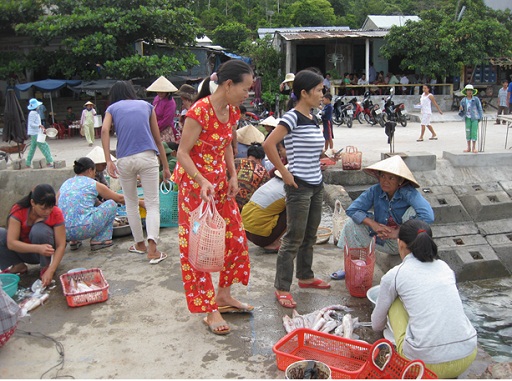 ที่ตลาดคึกคักพลุกพล่านไปด้วยผู้คน คนซื้อถือตะกร้าพลาสติกไปซื้อของ ส่วนคนขายเตรียมกระดาษและใบกล้วยเพื่อห่ออาหารชนิดต่างๆ การไม่มีถุงพลาสติกอาจจะทำให้การใส่อาหารเหลวและเปียกมีความลำบากหน่อยแต่การที่ทุกคนพูดไม่กับถุงพลาสติกก็ไม่สร้างความเดือดร้อนในการซื้อขาย ทุกวัน ประชาชนได้ฟังการประชาสัมพันธ์เกี่ยวกับผลร้ายของถุงพลาสติกที่มีต่อสิ่งแวดล้อม โดยเฉพาะ การที่ต้องเผชิญกับปัญหาขยะก่อมลพิษต่อสิ่งแวดล้อม ได้ทำให้ทุกคนเข้าใจเองและร่วมกันปฏิบัติ นายเหงวียนสื่อ เลขาธิการพรรคสาขานครโห่ยนอาน หนึ่งในผู้ที่ทุ่มเทกับขบวนการพูดจงไม่กับถุงพลาสติกกล่าวว่า“ทุกคนต่างมีความประสงค์ที่จะได่อยู่ในสภาพแวดล้อมที่สะอาดสวยงาม รวมทั้ง ประชาชนบนเกาะกู่ลาวจ่าม แต่คงเพราะทุกคนมัวแต่ทำงานหาเลี้ยงชีพจึงไม่มีเวลาสนใจถึงปัญหาสิ่งแวดล้อม จนถึงปัจจุบัน ผมรู้สึกมีความภาคภูมิใจมากเมื่อเห็นว่า ประชาชนบนเกาะกู่ลาวจ่ามสามารถทำในสิ่งที่ท้องถิ่นอื่นๆบนแผ่นดินใหญ่ไม่สามารถทำได้นั่นคือไม่ใช้ถุงพลาสติกและใช้วัสดุที่เป็นมิตรกับสิ่งแวดล้อม แทน”