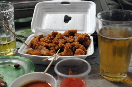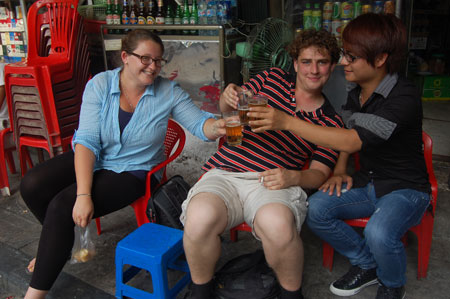 เบียร์สดที่นี่ได้ดื่มพร้อมกับแกล้มเช่น ถั่วลิสงคั่วหรือต้มและแหนมสดทอด นายเจม หนุ่มชาวไอร์แลนด์เพิ่งมาฮานอยและเพื่อนได้พามาเดื่มเบียร์ที่สี่แยกนานาชาติคุยกับพวกเราว่า เขารู้สึกถึงบรรยากาศแปลกๆ ณ ที่นี่ โดยทั้งดื่มเบียร์ทั้งพูดคุยกับเพื่อนๆและสัมผัสกับบรรยากาศที่พลุกพล่านไปด้วยผู้คน ส่วนนายมาร์ดอช แซม หนุ่มชาวอังกฤษที่อาศัยในเวียดนามมาหลายปีเผยว่า แม้มาที่นี่หลายครั้ง แต่ทุกครั้งที่มาเขามีความรู้สึกไม่เหมือนกันเพราะบรรยากาศและชีวิตที่นี่มีการเปลี่ยนแปลงไปตามกาลเวลา แม้พูดภาษาเวียดนามได้ไม่มากนัก แต่นายแซมก็พยายามกล่าวถึงความรู้สึกของตนว่า “ ผมชอบดื่มเบียร์และมาที่นี่ดื่มหลายปีแล้ว เบียร์สดที่นี่ถูกและอร่อย ”