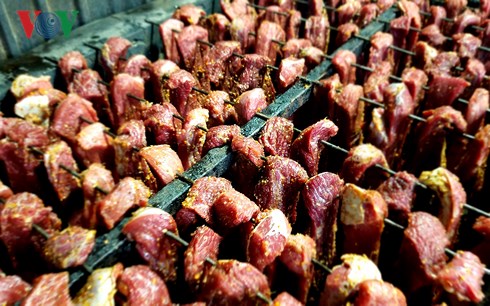 หลังจากหมักเครื่องเทศประมาณ 2 ชั่วโมงก็นำเนื้อไปเสียบไม้เหล็กแล้วอบให้พอสุกบนเตาถ่าน ในขณะที่อบต้องควบคุมความร้อนและเวลาให้ดี เพราะเนื้อแดดเดียวจะนิ่มและอร่อยหรือไม่ก็ขึ้นอยู่กับขั้นตอนนี้ ต่อจากนั้นก็นำไปอบในเตาอบอีก 10-12 ชั่วโมง นาย อาน เผยต่อไปว่า“โรงงานผลิตเนื้อแดดเดียวมีขนาดและเตาหินไม่เหมือนกัน ผมก็ทำเตาแบบง่ายๆ และใช้เหล็กเส้น หลังจากอบเนื้อให้สุกด้วยถ่านไม้ก็จะเอาเนื้อไปอบให้แห้งในเตาอบอีกทีเสร็จแล้วก็เอาออกมาพักให้เย็น แล้วไปบรรจุในถูงสูญอากาศเพื่อป้องกันไม่ให้แบคทีเรียเข้า ซึ่งสามารถเก็บได้นานและสะดวกในการขนส่ง”