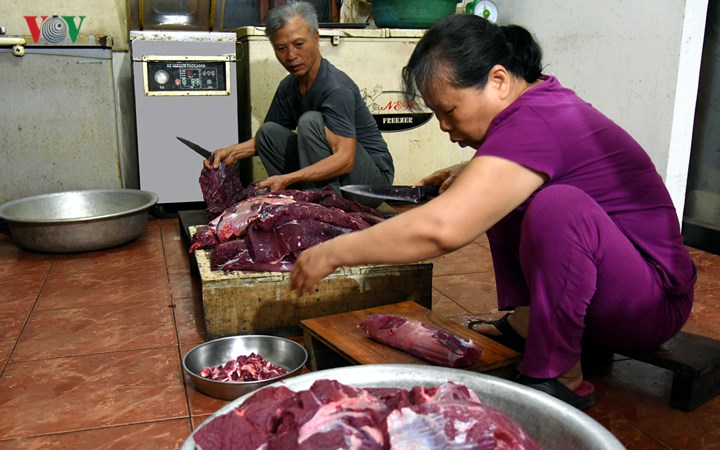 โรงงานผลิตเนื้อแดดเดียว เติมอาน ของนาย เจิ่นก๊วกอานและภรรยาคือ นาง เฟือง เปิดมากว่า 10 ปีแล้ว โดยผลิตภัณฑ์หลักคือเนื้อแดดเดียวที่ทำจากวัวที่เลี้ยงตามธรรมชาติบวกกับเคล็ดลับในการทำแบบเวียดนาม ก่อนเดินทางไปทำงานในประเทศลาว นาย อานและภรรยา มีอาชีพเสริมที่เวียดนามคือทำหมูยอและเนื้อรมควัน หลังจากเดินทางไปเยี่ยมลูกชายที่ทำงานในประเทศลาว และได้ลิ้มลองเนื้อแดดเดียวจากฝีมือของชาวลาว นาย อานและภรรยามีความคิดที่จะทำเมนูนี้ตามรสชาติของเวียดนาม เมื่อกล่าวถึงเหตุผลที่มีความผูกพันกับอาชีพทำเนื้อแดดเดียว นาย อาน เผยว่า “ผมคือเจ้าหน้าที่เกษียณอายุราชการ ลูกทำงานที่ประเทศลาว เมื่อปี 2010 ผมและภรรยามาเยี่ยมลูกที่ประเทศลาว และในขณะที่อยู่ในประเทศลาวก็เห็นว่า ผู้บริโภคนิยมเนื้อแดดเดียวมาก ดังนั้นครอบครัวได้พัฒนาอาชีพนี้ เนื้อวัวที่นี่ปลอดสารพิษ เพราะวัวกินหญ้าเท่านั้น ไม่เลี่ยน ดังนั้นอร่อยมาก”