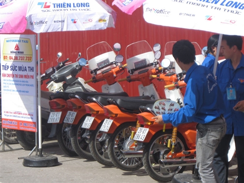 | บรรดาอาสาสมัครนักศึกษายังขับรถมอเตอร์ไซต์เพื่อส่งผู้เข้าสอบเอ็นทรานซ์ไปยังบ้านเช่าและสถานที่สอบ (Photo:tienphong ) |