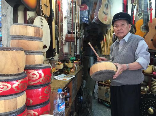 การเดินหาร้านกลองของคุณฝามชี๊ติ๋งบนถนนห่างน้อนนั้นไม่ยากเลยเพราะร้านมีการแขวนกลองไว้บริเวณสองข้างของประตูอย่างโดดเด่น โดยที่ร้านมีทั้งกลองใบเล็กและใบใหญ่ บางใบทาสีแดงและวาดลายเมฆแล้ว แต่บางใบก็ยังไม่ได้ทาสี นอกจากนี้ ในร้านยังมีเครื่องดนตรีอื่นๆ เช่น ด่านแจงหรือพิณ 16 สาย พิณสายเดียวและกีตาร์ เป็นต้น เพราะคุณฝามชี๊ติ๋ง วัย 85 ปีมีความสามารถทำได้ทั้งกลองและเครื่องดนตรีชนิดอื่นๆด้วย เขาได้เล่าเรื่องราวต่างๆในช่วงที่เขาเริ่มเรียนการทำกลองจากพ่อเมื่อกว่า 70 ปีก่อนว่า “ผมเกิดที่หมู่บ้านด๋อยตาม ตำบลยวีเตียน จังหวัดห่านาม ซึ่งอยู่ห่างจากกรุงฮานอยประมาณ 60 กิโลเมตร ชาวบ้านทุกคนในหมู่บ้านล้วนทำอาชีพผลิตกลอง ตอนอายุ 13 ปี ผมพร้อมกับคุณพ่อต้องอพยพไปจังหวัดเหงะอาน – ห่าติ๋ง พวกเราต้องเดินเท้า 7 วันเต็ม มือถือกิ่งไม้ใหญ่เพื่อหลบเครื่องบินทิ้งระเบิดของฝ่ายศัตรูและต้องหลบในหลุมหลบระเบิดริมถนน พอถึงจังหวัดเหงะอาน ผมและพ่อก็ทำอาชีพผลิตกลองเพื่อเลี้ยงชีพ ตอนอายุ 14 ปี ผมก็ผลิตกลองได้ด้วยตนเองและแยกกับพ่อเดินทางไปทำกลองในจังหวัดต่างๆในภาคเหนือและภาคกลางเวียดนาม ผมไม่เคยคิดว่า จะละทิ้งอาชีพนี้เพราะอาชีพนี้จะคงอยู่ตลอดกาล โดยเฉพาะเมื่อเรามีฝีมือดีก็จะมีคนสั่งซื้อเรื่อยๆ แม้รายได้ไม่สูงเท่ากับคนขายกลองแต่ก็พออยู่พอกิน”