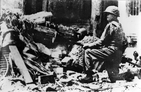 ![]() ทหารพลีชีพถือระเบิดต่อต้านรถถังพร้อมสละตัวพุ่งชนรถถังรถหุ้มเกราะเพื่อขัดขวางการเคลื่อนทัพของฝรั่งเศส