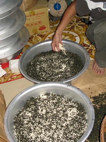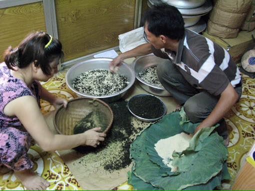นายต๊วนมีความชำนาญและทักษะในการทำชากลิ่นดอกบัวที่ยอดเยี่ยม โดยปกติชาแห้งปริมาณ ๑ กิโลกรัมจะต้องใช้เกสรดอกบัว ๑ กิโลกรัมเช่นกัน โดยคัดสรรเอาจากดอกบัวมากถึง ๑,๒๐๐ ดอก เมื่อตัดดอกบัวสดมาแล้วจะต้องนำดอกนั้นมาเก็บรักษาอย่างเพื่อเก็บรักษากลิ่นหอมจากเกสรให้ได้นานที่สุด จากนั้นจะนำใบชาแห้งมาจัดวางไว้เป็นชั้นๆอัดแน่นอยู่ภายในอ่างอลูมีเนียมขนาดใหญ่ โดยวางเกสรดอกบัวคั่นระหว่างชั้นของใบชาแล้วอบไว้อย่างดี นายต๊วนเปิดเผยต่อไปว่า “ ต้องอบชาในอ่างอลูมีเนียมและปิดด้วยถาด ในการอบชาเวลาอบนั้นไม่ตายตัว ๕ ชั่วโมงหรือ ๑๐ ชั่วโมง ซึ่งต้องอาศัยประสบการณ์ที่สั่งสมมาของครอบครัว เราต้องติดตามสภาพอากาศเพื่อระหวังไม่ให้ชาดูดซึมความชื้นและไม่อบกลิ่นดอกบัวอย่างเต็มที่ ยามฝนตกหรือแดดออสูตรการอบชาก็ไม่เหมือนกัน หากมีแดดต้องอบชากับเกสรดอกบัว ๗ ครั้ง แต่หากมีฝนตกและลมแรงต้องอบถึง ๘ ครั้งจึงจะได้ชาที่มีกลิ่นหอมดี ”