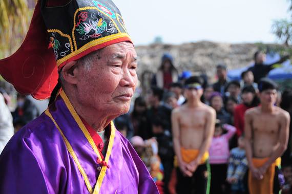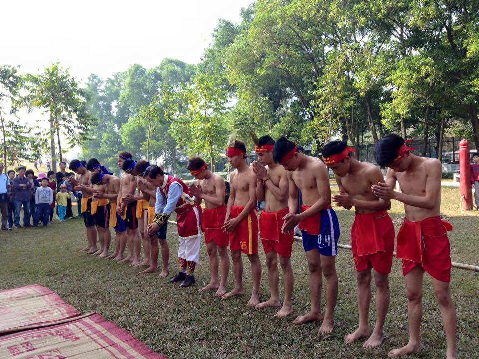 ห่างจากจุดที่หนุ่มๆกำลังผูกไม้ไผ่ประมาณ 5-6 เมตร ก็มีโต๊ะที่คลุมด้วยผ้าสีแดงเพื่อใช้แทนหิ้งบูชาในวิหารศาลเจ้าของหมู่บ้านเพื่อทำพิธีก่อนการเล่น นายเหงียนวันยอง อายุ 80 ปี ในชุดทำพิธีสีม่วงเผยว่า ในตลอด 3 – 4 ปีมานี้ เขามักจะถูกรับเลือกเป็นผู้ทำพิธี หลังจากที่เตรียมพร้อมทุกอย่าง คุญยองจะจุดธูป 3 ดอกเพื่อทำพิธี ส่วนด้านหลังก็มีชายหนุ่ม 12 คนที่มีอายุตั้งแต่ 16-20 ปี ใส่กางเกงขาสั้นสีแดงและสีเขียวยืนเข้าแถวและพนมมือไหว้อย่างเคารพ