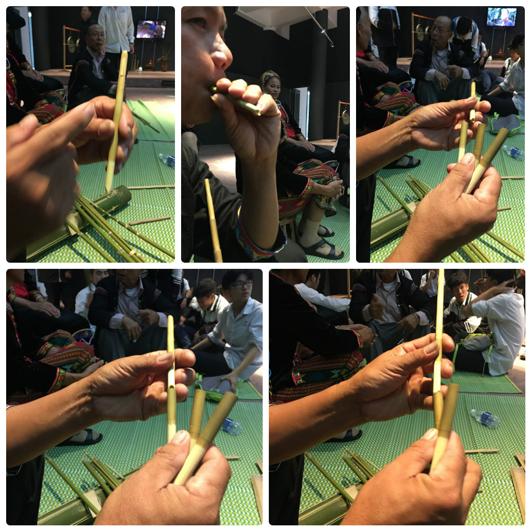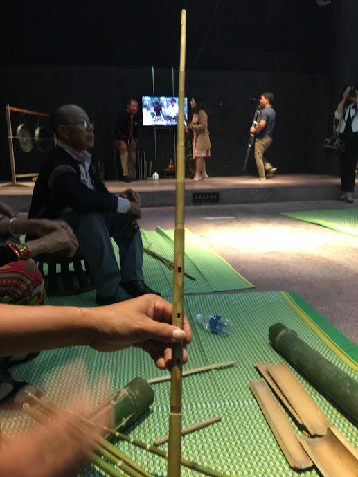 ที่ลานหน้าห้องจัดแสดงและสาธิตวัฒนธรรมของพิพิธภัณฑ์ชาติพันธุ์เวียดนาม ศิลปินชนเผ่าขมุ 2 คนที่เป็นนักร้องหญิงและนักดนตรีเป่าปี่ อายุ 40 ปีกำลังฝึกซ้อมก่อนการแสดง โดยนักร้องหญิงใส่เสื้อแขนยาวสีดำ เสื้อข้างในสีแดงและกระโปรงสีดำยาวถึงข้อเท้า ศีรษะโพกผ้าที่มีหลากหลายสีสัน มีลวดลายพื้นเมืองและสวมสร้อยคอเงิน ส่วนนักดนตรีเป่าปี่เป็นผู้ชายใส่เสื้อแขนยาวและกางเกงขายาวสีดำ กำลังเป่าปี่ที่มีความยาว 1เมตร เส้นผ่าศูนย์กลาง 1เซนติเมตร โดยใช้นิ้วมือปิดเปิดที่รู 3 รูบนลำปี่