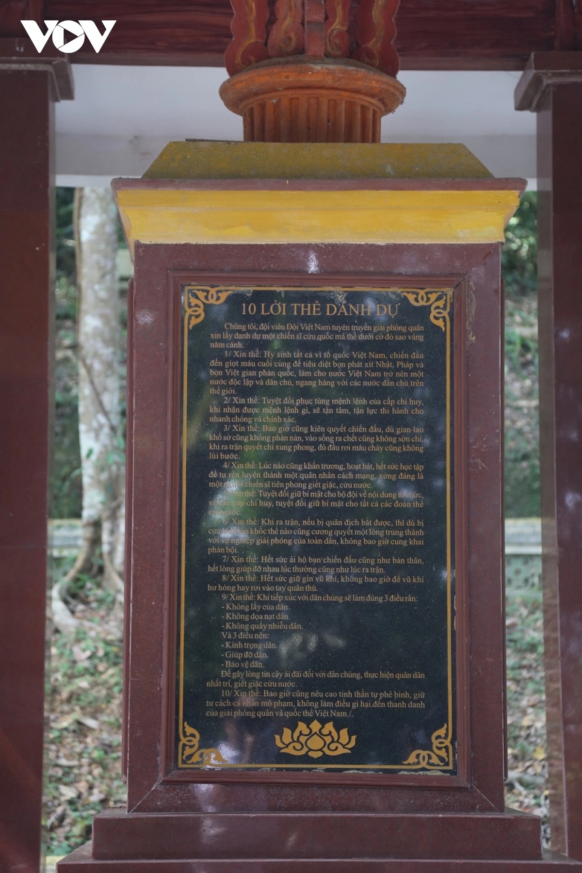 เนื้อหาหลักของคำสาบานคือ จงรักภักดีต่อประเทศ ต่อพรรคและประชาชน พร้อมต่อสู้และสละชีพภายใต้ธงชาติอันรุ่งโรจน์ของปิตุภูมิ ซึ่งเป็นสิ่งที่ศักดิ์สิทธิ์ ยืนยันจิตใจแห่งความสามัคคี ความมุ่งมั่นตั้งใจต่อสู้ สละชีพเพื่อปกป้องเอกราชและอธิปไตยของประเทศ ปกป้องประชาชน พันโท เหงียนกวน ทหารผ่านศึกเจื่องเซิน ที่ปัจจุบันอายุ 95 ปีกล่าวว่า ตนโชคดีและรู้สึกเป็นเกียรติอย่างยิ่งที่ได้เข้าร่วมกองทัพนับตั้งแต่ปี 1946 และได้เข้าร่วมสงครามกู้ชาติ 2 ครั้ง ซึ่งชีวิตการเป็นทหารได้ช่วยให้เขามีความเข้าใจมากขึ้นเกี่ยวกับความศักดิ์สิทธิ์ของคำสาบาน 10 ข้อนี้