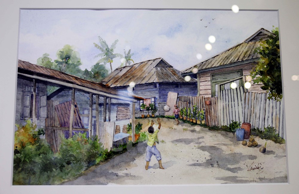 บนผิวน้ำสีฟ้า เรือไม้กำลังพาผู้โดยสารชมความงามของแม่น้ำ สองริมฝั่งมีอาคารสองชั้นหลังคาทรงสามเหลี่ยมสีส้มตั้งอยู่เรียงรายกัน ก่อนชมภาพวาดสีน้ำ “แม่น้ำสิงคโปร์” ของศิลปิน Seah Kam Chuan มีไม่กี่คนที่รู้ว่า ใจกลางเมืองสิงคโปร์ก็มีภาพที่สวยงามเช่นนี้ ในจำนวนภาพวาดสีน้ำ 25 ภาพ ที่ถูกจัดแสดงในงานมี 3 ภาพเกี่ยวกับหมู่บ้าน Longrong Buangkok โดยมีบ้านชั้นเดียวที่ทำจากไม้และสังกะสี มีรั้วที่ทำจากไม้หรือต้นไม้ขนาดเล็ก แม่กำลังพาลูกไปโรงเรียน ฝูงไก่หาอาหาร มีคนกำลังตัดหญ้าหน้าบ้าน และไกลๆก็มีผู้ชายกำลังขี่จักรยานซึ่งเป็นหนึ่งในภาพที่บรรยายวิถีชีวิตที่หาดูได้ยากในสิงคโปร์ปัจจุบัน ส่วนมุมด้านซ้ายของผนังคือภาพที่มีชื่อว่า “ตลาด Lau Pa Sat” หรือที่คนสมัยก่อนเรียกว่าตลาด Telok Ayer โดยในภาพมีร้านอาหารพื้นเมืองหลายร้านซึ่งสร้างความประทับใจให้แก่ผู้เข้าชมงานหลายคนเมื่อได้เห็นทัศนียภาพที่สวยงามหลายแห่งของสิงคโปร์ที่คล้ายเวียดนาม“ดิฉันเห็นว่า ภาพวาดสีน้ำมีสีสันที่กลมกลืนไม่ฉูดฉาดซึ่งมีความคล้ายคลึงกับเวียดนาม ดิฉันชอบมาก สิงคโปร์เป็นประเทศที่ทันสมัยและเป็นมังกรแห่งเอเชีย ก่อนเข้าชมงานนิทรรศการ ดิฉันคิดว่า สิงคโปร์เป็นประเทศที่ทันสมัยที่มีแต่อาคารระฟ้าแต่เมื่อดูภาพวาดในงาน ดิฉันเห็นว่า สิงคโปร์ก็มีทัศนียภาพที่สวยงาม เงียบสงบเหมือนที่เวียดนาม”
