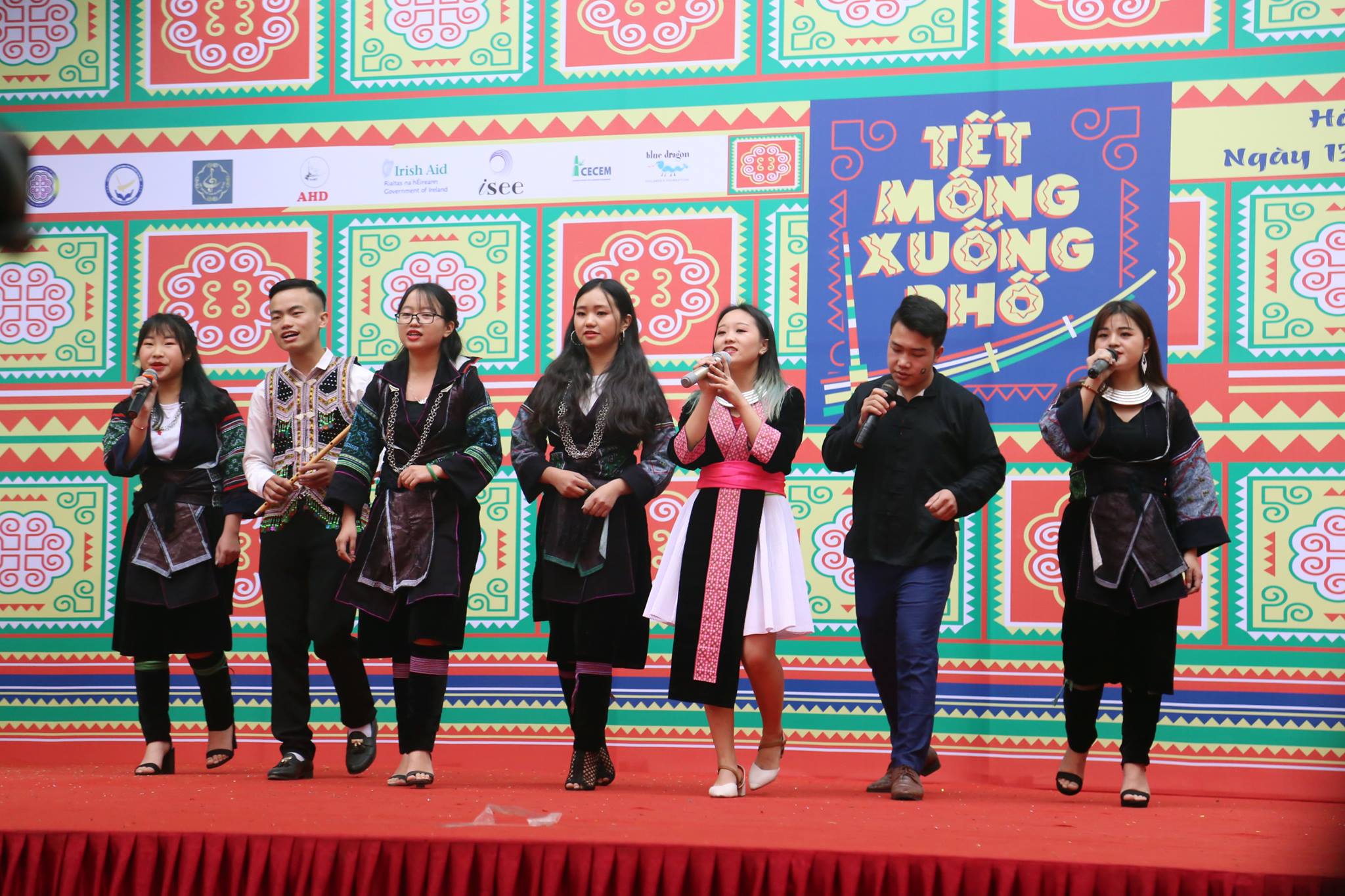 นอกจากสวมใส่ชุดแต่งกายพื้นเมืองแล้ว เยาวชนชาวม้งที่เข้าร่วมงานยังมีการแสดงที่เป็นเอกลักษณ์วัฒนธรรมของชนเผ่าม้ง โดยใช้ภาษาม้งเป็นหลัก คุณเห่ออากูโอ อายุ 18ปี ชาวม้งแดงจากจังหวัดเอียนบ๊าย ซึ่งเป็นนักษึกษาปีที่หนึ่งคณะก่อสร้างของมหาวิทยาลัยชลประทานและคุณซุงถิยุง อายุ 21ปี ชาวม้งฮวาจากจังหวัดลาวกาย นักศึกษาคณะงานด้านสังคมของมหาวิทยาลัยแรงงานและสังคมศาสตร์กำลังฝึกร้องเพลง“Tin vào duyên số” หรือ แปลว่า “เชื่อในชะตา”