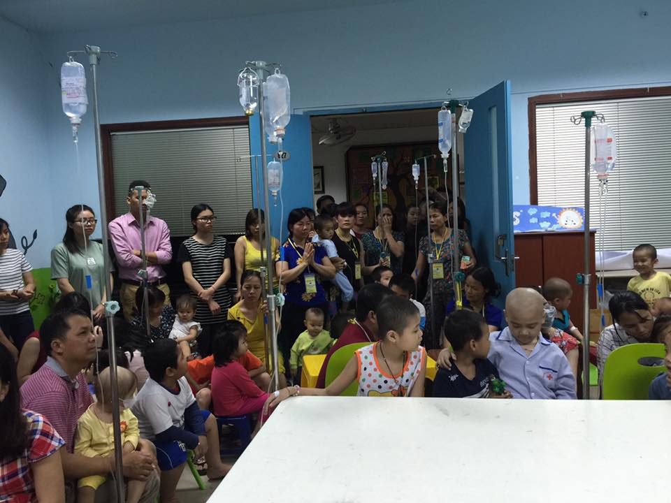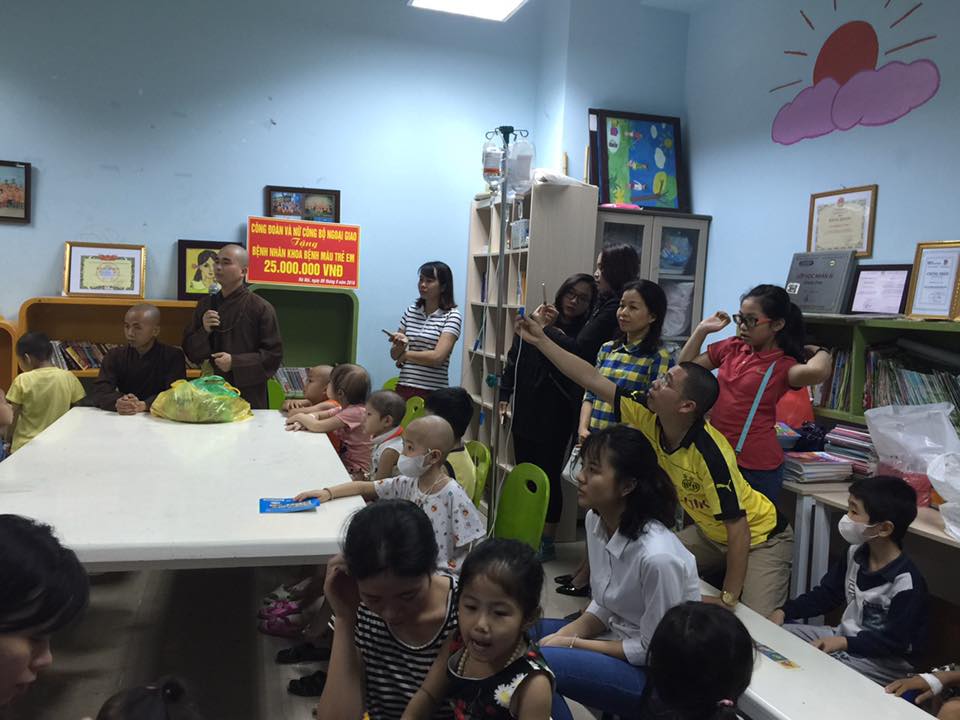 นอกจากการสอนวาดภาพให้แก่ผู้ป่วยเด็กแล้ว ทุกเดือน กลุ่มผู้ช่วยเหลือเพื่อการกุศลยังนิมนต์พระสงฆ์มาเทศน์ เพื่อช่วยให้ผู้ป่วยและญาติมิตรมีความมุ่งมั่นในการสู้กับโรคร้าย วันนี้ พระสงฆ์ หว่างยาฟ เจ้าอาวาสวัดเวินฟองในจังหวัดบั๊กนิงได้พูดคุยกับผู้ป่วยในโรงพยาบาล “อาตมามาที่นี่ 3 ครั้งแล้ว ทุกครั้งที่มาที่นี่อาตมาจะสอนเกี่ยวกับพลังชีวิตของคนเพื่อให้ผู้ป่วยเด็กมีความมุ่งมั่นในการใช้ชีวิตและมีความเชื่อมั่นเกี่ยวกับอนาคตที่สดใส โดยให้มองว่า การป่วยเป็นเรื่องธรรมดา สิ่งที่สำคัญคือเราต้องไม่จมกับความเศร้าโศกเนื่องจากอาการป่วย แต่อยากให้มองว่า เรายังมีเพื่อนมิตรที่คอยให้กำลังใจเพื่อต่อสู้กับอาการป่วย ถ้าพวกเราได้มีโอกาสพบกันก็ต้องดูแลกันเป็นอย่างดี”