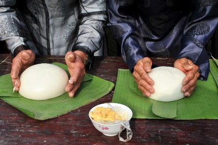 บรรยากาศที่คึกคักที่สุดในงานเทศกาลขนมแบ๊งใหญ่ในหมู่บ้านจุ๊กเฟก็คือการแข่งตำขนม แต่ละทีมมีสมาชิก4คนตำขนมท่ามกลางบรรยากาศที่คึกคัก หลังจากตำขนมเป็นเวลา15-20นาที ชาวบ้านก็เริ่มปั้นขนม ซึ่งขั้นตอนนี้ต้องทำอย่างรวดเร็วในขณะที่แป้งยังร้อนอยู่