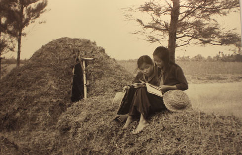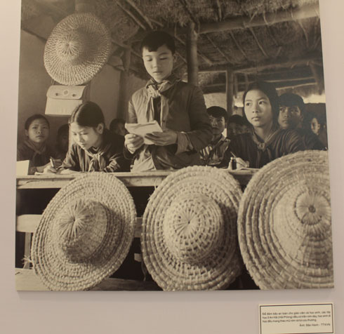 ภาพที่ใหญ่ที่สุดตั้งอยู่ตรงกลางห้องแสดงเป็นภาพเด็กหญิง2คนสวมหมวกฟางไปโรงเรียน ใบหน้าที่บริสุทธิ์ไร้เดียงสาของเด็กน้อยได้สะท้อนให้เห็นว่า ถึงแม้ห่ากระสุนระเบิดของศัตรูจะดุเดือดแค่ไหนแต่ก็ไม่สามารถขัดขวางการศึกษาเล่าเรียนของพวกเขาได้ โดยห้องเรียนตั้งแต่ชั้นอนุบาลไปจนถึงประถมต่างอยู่ในอุโมงใต้ดินและนักเรียนทุกคนรู้จักขุดหลุมหลบระเบิด ขุดคูเชื่อมต่อกันเพื่อใช้เดินทางไปยังจุดต่างๆ รวมทั้งได้ฝึกทักษะการปฐมพยาบาล ฝึกทำขนมปังและอาหา ส่วนสิ่งของติดตัวไปโรงเรียนทุกวันนั้นนอกจากสมุดปากกาแล้วยังมีกระเป๋าใส่ชุดปฐมพยาบาลและหมวกฟางและแม้จะต้องเรียนไปพักไปเนื่องจากสัญญาณเตือนภัยฉุกเฉิน เสียงระเบิดและเสียงเครื่องบินทิ้งระเบิดดังสนั่นหวั่นไหวแต่นักเรียนทุกคนยังคงมุ่งมั่นพยายามเรียนให้ดีเรียนให้เก่งและเข้าร่วมกิจกรรมการผลิตท่ามกลางเสียงเพลงที่คึกครื้นเพื่อสร้างขวัญกำลังใจให้แก่กัน นาย เหงวียนซวนเลียน อายุ70ปีผู้ชมอีกคนเผยว่า ภาพต่างๆได้ชวนให้เขานึกถึงช่วงเวลาในอดีต ในช่วงนั้นคุณจะไม่เห็นความหวาดกลัวบนใบหน้าของเด็กทุกคน ชีวิตยามสงครามก็ยังดำเนินไปตามปกติเว้นแต่เมื่อมีสัญญาณเตือนเครื่องบินมา พ่อแม่ก็พาไปที่หลุมหลบระเบิดซึ่งก็ไม่ได้ยินเสียงร้องไห้ของเด็กๆแต่อย่างใด