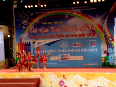 ที่ท่านกำลังได้ยินอยู่ขณะนี้คือการแสดงแอโรบิคแดนซ์ของนักเรียนประถมศึกษาเงียะโด กรุงฮานอยในการแข่งขันแอโรบิคแดนซ์สำหรับเด็กอนุบาลและประถมศึกษาภายใต้ชื่อ “ ฮานอย คิดส์ แอโรบิค แชมเปียนชิป ๒๐๑๓ ” ซึ่งเป็นกิจกรรมใหม่ที่ได้รับความสนใจของเด็กจากโรงเรียนและสโมสร ๒๐ แห่งในพื้นที่นครหลวง นี่เป็นโอกาสให้เด็กได้เล่นสนุกพบปะกับเพื่อนคนใหม่ๆและฝึกร่างกาย คุณเหงวียนถุ่ยเตียนพาลูกมาร่วมการแข่งขันคุยกับพวกเราว่า“ นี่เป็นโอกาสให้เด็กฝึกจิตใจแห่งความมั่นใจในตัวเอง ความแข็งแกร่งและเรียนรู้วิธีดำรงชีวิต อีกทั้งทำให้สุขภาพแข็งแรงขึ้น พบเพื่อนใหม่ๆและมีมนุษย์สัมพันธ์ดีขึ้น นี่เป็นเวลาเริ่มต้นของการปิดภาคเรียนการศึกษา เด็กๆจะได้เข้าร่วมกิจกรรมต่างๆที่หลากหลายอย่างสนุกสนาน” ภายในงานยังมีการจัดกิจกรรมอย่างหลากหลายรูปแบบไม่ว่าจะเป็นงานนิทรรศการภาพวาด การแสดงศิลปะและมีของเล่นมากมายให้เด็กเล่นตามใจชอบ