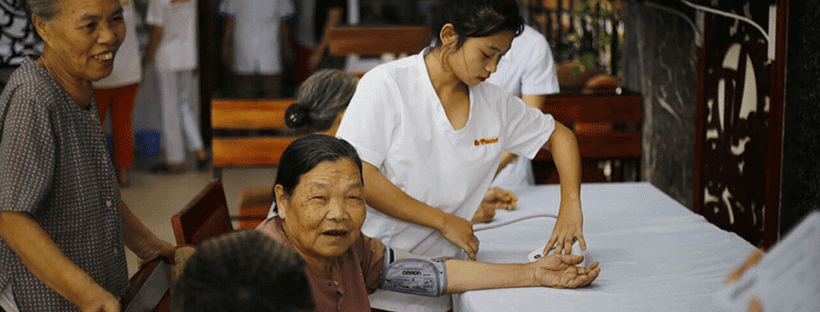 ในชั้น 6 ซึ่งเป็นชั้นสุดท้ายของ Orihome เราพบคุณป้า หญวน อายุ 89 ปีกำลังออกกำลังกายและอธิบายว่า ฝึกเครื่องนี้ช่วยให้หลังของผู้สูงอายุไม่ค่อม หากใครหลังค่อมก็จะค่อยๆดีขึ้น ทุกวันคุณป้า หญวน จะฝึกเป็นเวลา 20 นาที เสร็จแล้วก็ไม่ปวดไม่เหนื่อย ในชั้นนี้ มีเครื่องออกกำลังกายหลายเครื่อง เช่น เครื่องฝึกหลังและเอว เครื่องฝึกมือและเครื่องฝึกเท้า เป็นต้น ซึ่งช่วยให้ผู้สูงอายุลดความเสี่ยงจากอาการป่วยต่างๆ คุณลอง ลูกชายของคุณป้าห่ง ผู้สูงอายุที่ป่วยเป็นโรค Parkinson ที่ Orihome ให้ข้อสังเกตว่า “พยาบาลที่นี่ให้การดูแลเอาใจใส่ผู้สูงอายุเป็นอย่างดี เช่น ถามว่า ชอบกินอะไร และให้การดูแลด้านสาธารณสุข เช่น วัดความดันโลหิต แช่เท้า และฝึกโยคะ เป็นต้น ซึ่งมีประสิทธิภาพมากกว่าอยู่ที่บ้าน สิ่งที่สำคัญคือ หากให้ผู้สูงอายุที่ป่วยเป็นโรคนี้อยู่ที่บ้าน ก็กลัวว่า พวกเขาจะไปไหนก็ไม่รู้ อย่างเช่นพ่อของผม ผมก็มั่นใจที่ฝากให้พยาบาลดูแลพ่อแทนผม”