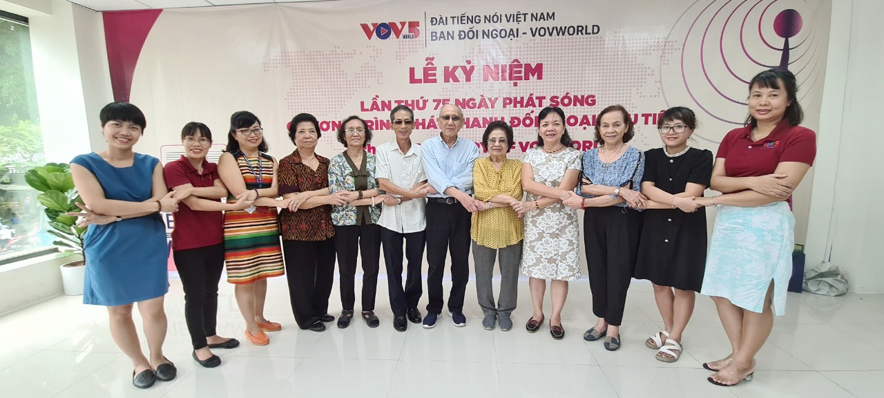 เจ้าหน้าที่ภาคภาษาไทยรุ่นต่างๆในโอกาสรำลึกครบรอบ 75 ปีวันออกอากาศครั้งแรกของส่วนกระจายเสียงต่างประเทศหรือวีโอวี5 |