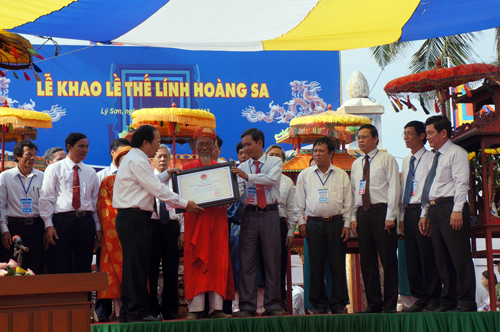 | พิธีรับมอบหนังสือรับรองพิธีKhao lề thế ทหารHoàng Saเป็นมรดกวัฒนธรรมนามธรรมระดับชาติ(Photo:chinhphudientu ) |
