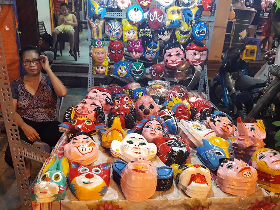 เวลา 18.00 น. ของวันอาทิตย์เหลืออีกไม่ถึง 2 วันก็จะถึงวันสารทไหว้พระจันทร์ ซึ่งบรรยากาศที่ถนนห่างเหลือกและถนนห่างหมาในย่านถนนโบราณ 36 สายที่ขายของเล่นทั้งของเล่นสมัยใหม่และของเล่นพื้นเมืองหลากหลายสีสัน เช่นโคมไฟและหน้ากากหลายชนิดมีความคึกคักเป็นพิเศษ เนื่องจากคนมาซื้อของเล่นและเดินเที่ยว ที่บูธขายหน้ากากกระดาษขนาดพื้นที่เกือบ 5 ตารางเมตรของคู่ภรรยาสามีคือนาย เหงียนวันหว่าและนาง ดั่งเฮืองลาน กำลังมีลูกค้ามาอุดหนุนอย่างคับคั่ง