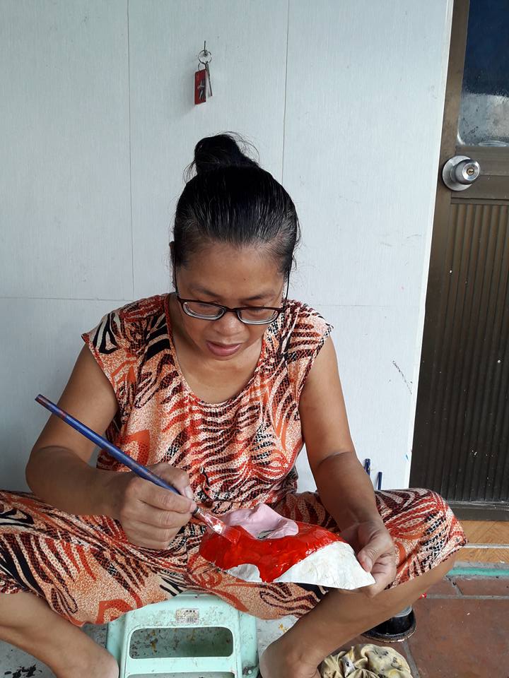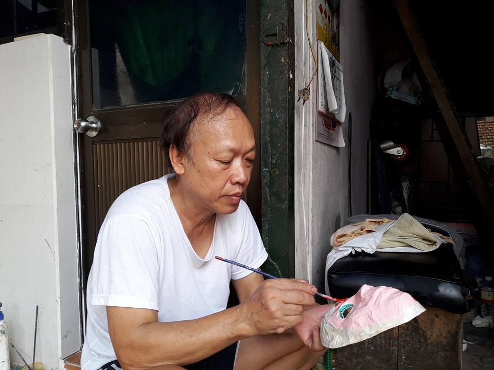 เพื่อให้เห็นกับตาถึงวิธีการทำหน้ากากของคู่ภรรยาสามี นาง ลานและนาย หว่า เช้าวันรุ่งขึ้น พวกเราจึงได้เดินทางไปเยี่ยมบ้านของนาง ลาน ตรงกับช่วงที่พวกเขากำลังทาสีบนหน้ากากควาย ในตลอดกว่า 30 ปีที่ผ่านมา นาง ลาน และนาย หว่า ยังคงทุ่มเทให้แก่อาชีพนี้บนชั้น 3 ของบ้านที่มีพื้นที่เกือบ 40 ตารางเมตร “พวกเราทำหน้ากากตลอดปี แต่ในช่วงเทศกาลไหว้พระจันทร์ มีลูกค้ามาซื้อมากกว่าปกติา พวกเราต้องทำเรื่อยๆทั้งปีเพื่อเตรียมให้แก่ช่วงเทศกาลไหว้พระจันทร์ เพื่อตอบสนองความต้องการของลูกค้า หน้ากากทำจากพลาสติกไม่สวยเหมือนหน้ากากทำจากกระดาษ ถ้าทำหน้ากากด้วยเครื่องจักรกลจะเร็วกว่าทำด้วยมือเหมือนพวกเรา พวกเราทำหน้ากากกระดาษได้วันละ 7-8 อัน หน้ากากที่ทำง่ายก็จะทำเสร็จเร็วกว่า โดยทำได้ 11-12 อันต่อวัน ทำด้วยมือเหนื่อยมาก ต้องพักบ้าง ครอบครัวของดิฉันมีพี่น้อง 7 คน แต่ไม่มีใครประกอบอาชีพนี้ เมื่อปี 1979 เมื่อพวกเราแต่งงาน คุณพ่อได้สืบทอดอาชีพนี้ ในตอนนั้นพวกเราทั้งทำงานในสำนักงานภาครัฐและทำงานนี้เป็นงานเสริม เมื่อเกษียณอายุราชการ พวกเราจึงทุ่มเทตั้งใจประกอบอาชีพนี้เต็มที่”