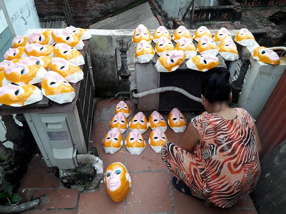 หลังจากเอาหน้ากากออกจากแม่พิมพ์ จะนำไปตากให้แห้งเพื่อรักษารูปทรงของหน้ากากให้เหมือนเดิม ถ้าใช้เครื่องอบแห้ง หน้ากากจะเสียรูปทรง ดังนั้นในวันที่มีแดด นาง ลานและนาย หว่า ก็จะเอาหน้ากากไปตาก สำหรับการทาสีคือขั้นตอนที่สำคัญที่สุด เพราะหน้ากากจะสวยหรือไม่ก็ขึ้นอยู่กับขั้นตอนนี้ โดยจะทาครั้งละหนึ่งสีเท่านั้น พอแห้งก็ทาสีอื่นๆต่อ ซึ่งหน้ากากจะดูสวยงามและดูมีมิติ เมื่อเทียบกับหน้ากากที่ทำจากพลาสติกและแม่พิมพ์ หน้ากากที่ทำจากกระดาษของนาง ลาน ดูสวยกว่าอย่างชัดเจน “หน้ากากที่ทำด้วยมือมีน้ำหนักเบา แข็ง สีสันชัดเจนและดูสวยงาม มีลูกค้าหลายคนพาลูกและหลานมาซื้อหน้ากาก ส่วนใหญ่ต้องซื้อหน้ากากกระดาษก่อนแล้วก็ไปซื้อของเล่นอื่น เมื่อก่อนการมีหน้ากากกระดาษเอาไว้เล่นในเทศกาลไหว้พระจันทร์คือความฝันของเด็กหลายๆคน พวกเขาพาลูกหลานมาซื้อของเล่นพื้นเมืองนี้ก็เพื่อรำลึกถึงตอนเป็นเด็ก”