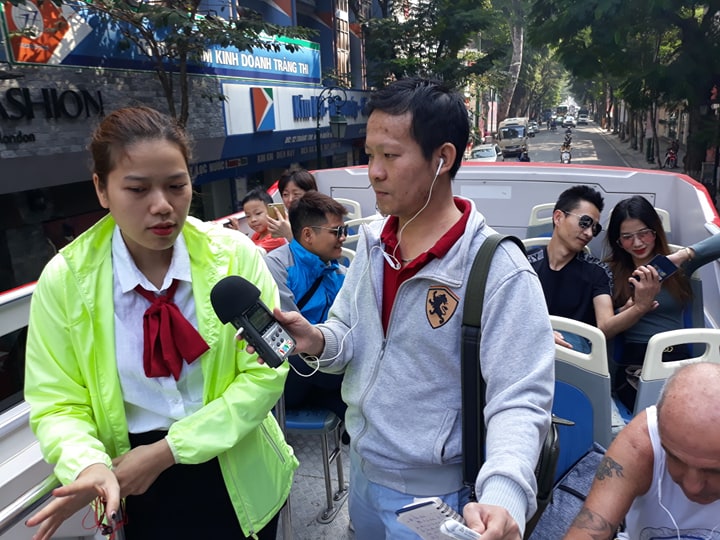 ท่านผู้ฟังครับ ผมกำลังยืนอยู่ที่จตุรัส “ดงกิงเหงียะถูก” ริมทะเลสาปหว่านเกี๊ยม ใจกลางกรุงฮานอย ตรงหน้าผมคือรถเมล์สองชั้น Hop On Hop Off สีแดงที่เพิ่งให้บริการนักท่องเที่ยวตั้งแต่ 6 เดือนก่อน แม้ขณะนี้ฮานอยได้เข้าฤดูหนาวแต่สภาพอากาศก็ยังเย็นสบายเหมาะสำหรับการใช้บริการรถเมล์ 2 ชั้นเที่ยวกรุงฮานอย และตอนนี้ผมจะลองไปพูดคุยกับพนักงานขายตั๋วของบริษัท Transerco Ha Noi ซึ่งเป็นบริษัทให้บริการรถเมล์สองชั้นและนักท่องเที่ยวก่อนที่เราจะลองใช้บริการกันนะครับ “ลูกค้าส่วนใหญ่ที่มาใช้บริการเป็นนักท่องเที่ยวชาวต่างชาติที่มาจากประเทศต่างๆ เช่น มาเลเซีย ไทย สาธารณรัฐเกาหลี ญี่ปุ่น สหรัฐและแคนาดา พวกเขาต่างพอใจต่อการให้บริการของไกด์บนรถเมล์มาก”