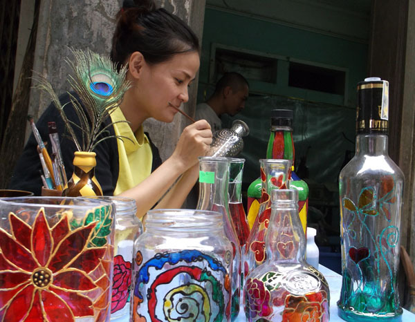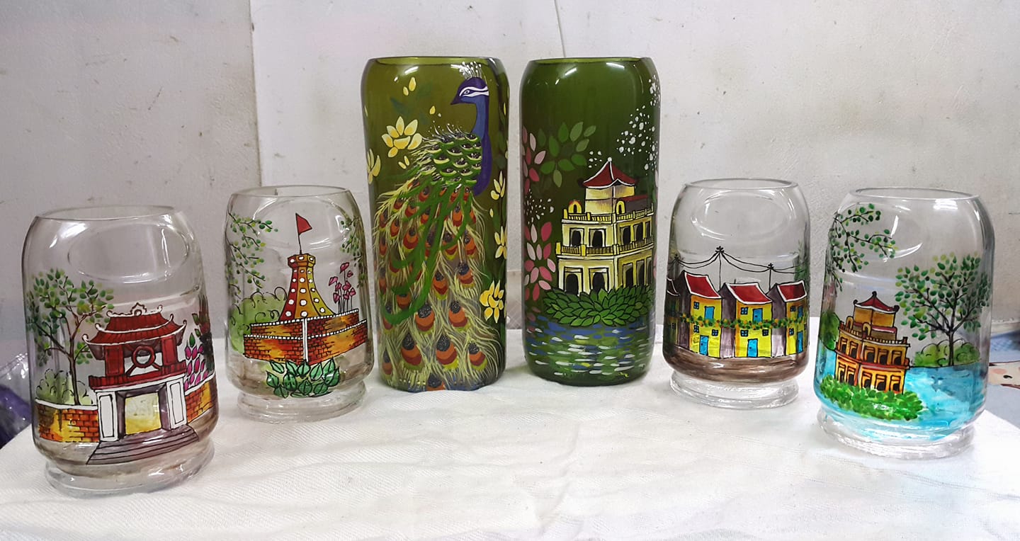 ในห้องของนาย เติมและนาง ถุย ขวดแก้วรูปทรงต่างๆนับร้อยขวดที่ถูกแต่งแต้มสีสันเพื่อใช้เป็นแจกันดอกบัว แจกันดอกเบญจมาศ หรือทำเป็นแก้วน้ำที่วาดลายสถานที่ท่องเที่ยวที่มีชื่อเสียงในกรุงฮานอย ซึ่งเป็นผลิตภัณฑ์ที่ได้รับความนิยมจากลูกค้าเป็นอย่างมาก โดยสามารถมอบเป็นของที่ระลึกให้แก่ญาติมิตรหรือเพื่อนมิตรชาวต่างชาติ สำหรับราคาขายนั้นก็เริ่มตั้งแต่ 1 แสนด่งถึงเกือบ 1 ล้านด่งหรือ 150 บาทถึง 1,500 บาท เมื่อกล่าวถึงเหตุผลที่ประกอบอาชีพนี้ นาง ถุย เผยว่า “เมื่อก่อน ดิฉันเรียนที่มหาวิทยาลัยวิจิตรศิลป์อุตสาหกรรม คณะการออกแบบ หลังจากเรียนจบ ดิฉันก็ศึกษาความรู้เพิ่มเติมจากอินเตอร์เน็ตจนพบกับเว็ปไซต์ที่แนะนำการวาดภาพบนขวดแก้วและดิฉันก็ลองวาดดู ในตอนแรก ดิฉันใช้สีที่มีอยู่ เช่นสี Arcylic เพื่อวาดบนขวดแก้ว ต่อมา ดิฉันได้ศึกษาในเชิงลึกและใช้สีสำหรับวาดบนขวดแก้ว โดยเฉพาะหลังจากนั้น สามีเห็นว่า นี่คืออาชีพที่น่าสนใจจึงเริ่มนำขวดมาดัดแปลง เพราะขวดสุรามีรูปทรงที่สวยและเป็นการนำของเก่ากลับมาใช้ใหม่เพื่ออนุรักษ์สิ่งแวดล้อม”