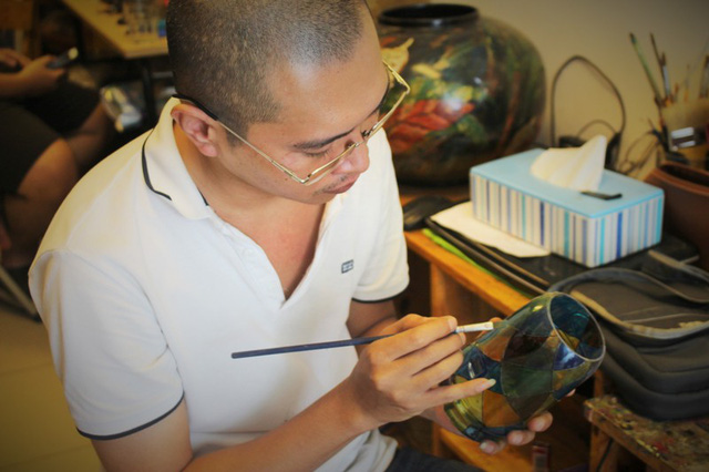 เวลา 09.00 น. บนชั้น 2 ที่บ้านของสองสามีภรรยานาย ดิงเทียนเติมและนาง เหงียนเหยี่ยวถุย ที่มีพื้นที่กว่า 30 ตารางเมตร ในถนนหงอกห่า กรุงฮานอย ทั้งคู่กำลังทำการเรียงขวดแก้วตามขนาดและสีสันเพื่อเตรียมวาดภาพบนขวดเหล่านี้ตามใบสั่งซื้อของลูกค้า โดยนาย เติม ทำการร่างแบบบนกระดาษก่อน เช่นวัดเสาเดียว สระคืนดาบ ดอกบัว สาวในชุดประจำชาติ Ao dai และสะพานลองเบียน เป็นต้น ส่วนนาง ถุย จะติดแบบร่างที่ขวดแล้ววาดตามแบบด้วยสีสำหรับวาดบนกระจก นาง ถุย วาดกรอบก่อน แล้วใช้สีอื่นๆแต่งเติมให้ขวดมีชีวิตชีวาและสวยขึ้น นาง ถุย กล่าวว่า“การทำสีบนวัสดุแต่ละอย่างต้องใช้สีที่แตกต่างกัน ดังนั้น การวาดบนขวดแก้วก็ต้องใช้สีเฉพาะเหมือนกัน สีสำหรับวาดบนแก้วขวดจะใช้สีสะท้อนแสง โดยดิฉันมักจะซื้อสีที่นำเข้าจากฝรั่งเศส ซึ่งมีราคาค่อนข้างแพง เพราะไม่ค่อยมีใครนำเข้าสีประเภทนี้จากต่างประเทศ ถ้าทำแบบอุตสาหกรรม ต้องแกะสลักวาดภาพและนำไปเผาเพื่อให้สีติดทนนาน แต่ดิฉันทำด้วยมือไม่มีการเผาหรือแกะสลัก ดังนั้นต้องใช้เวลาตากให้แห้ง 2 วันถึงจะใช้ได้”