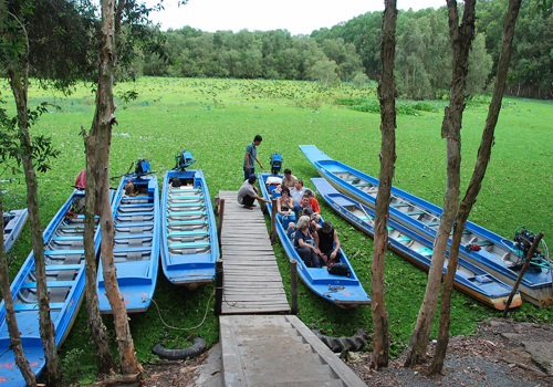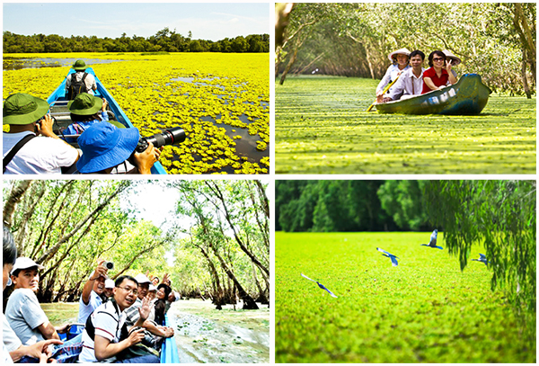 ชาวบ้านที่อาศัยในบริเวณป่าเสม็ดเป็นไกด์นำเที่ยวพายเรือแนะนำความสวยงามของป่า เรือแจวแล่นช้าๆ นักท่องเที่ยวดื่มด่ำกับบรรยากาศที่สงบ ชมฝูงนกและนกกระสาที่เกาะบนกิ่งต้นเสม็ด ชมรังนกขนาดใหญ่และสวยๆตลอดจนชมนกกระยางหลากหลายสีสัน นายเหงวียนวันเลิม ชาวบ้านที่อาศัยในบริเวณนี้เปิดเผยว่า“ พื้นที่นี้เป็นคันน้ำป้องกันน้ำทะลักไหลเข้ามาและรักษาให้มีน้ำตลอดทั้งปี ดังนั้นนักท่องเที่ยวสามารถมาเที่ยวได้ทุกเดือน ที่นี่เป็นแหล่งอาศัยของสัตว์น้ำและสัตว์นานาชนิดโดยเฉพาะจำพวกปลาเช่น ปลาชะโด ปลาหมอ ปลายาว จำพวกสัตว์เลื้อยคลานเช่นงูเหลือม งูและเต่า ตลอดจนนกและนกกระสา ที่นี่จึงนับเป็นป่าสงวน ”