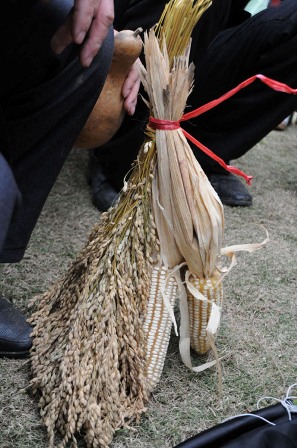 ข้าวโพดและรวงข้าวจะแขวนที่เสาตุง