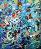 ผลงานแต่ละชิ้นได้แฝงความหมายอันลึกซึ้งภายในตัว ซึ่งสะท้อนทัศนะของนายสตีฟจอบส์ในการประกอบธุรกิจที่ได้สร้างผลิตภัณฑ์อันหลากหลายแต่เป็นมิตรกับชาวโลกทุกคนเปรียบเสมือนแอปเปิลลูกหนึ่ง ซึ่งสาส์นนี้ได้สะท้อนในภาพขียน “ เดอะวีชั่น ” ส่วนภาพเขียน “ พิสเซส-๒ ” หรือการเดินสวนทาง เป็นการส่งสาส์นเกี่ยวกับความคิดอันหลากหลายและแตกต่าง ความกล้าคิดและกล้าทำ ทั้งนี้และทั้งนั้นจะช่วยให้คุณเปลี่ยนมุมมองต่อโลก จิตรกรบุ่ยวันคัวคุยกับพวกเราเกี่ยวกับการเขียนภาพเหล่านี้ว่า “ การเขียนภาพบุคคลผู้มีชื่อเสียงด้านวิทยาศาสตร์และเทคโนโลยีเป็นเรื่องยากเพราะเราต้องเขียนอย่างไรให้ผู้ชมได้เข้าใจและมีความรู้สึกถึงบุคคลิกของเขา ภาพเขียนภาพแรกของผมเกี่ยวกับนายสตีฟจอบส์โดยผมเน้นในดวงตาที่สะท้อนให้เห็นโลกใหม่ในด้านเทคนิก ภาพแต่ละชิ้นของผมเป็นการถ่ายทอดออกมาจากปลายพู่กันโดยการใช้สีและเนื้อหาเพื่อสะท้อนผลงานอันโดดเด่นของนายสตีฟจอบส์”