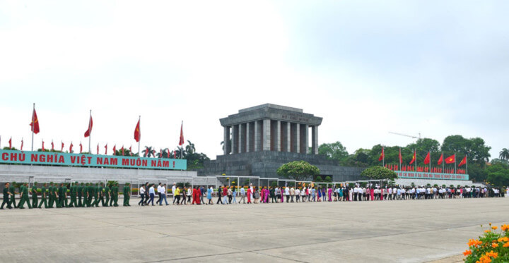 เวลา7.30น คนที่เข้าแถวกันเริ่มเคลื่อนขบวนเพื่อเข้าไปเคารพศพประธานโฮจิมินห์ด้วยความตื้นตันใจเป็นอย่างมาก ซึ่งเมื่อได้ยืนอยู่ที่จตุรัสบาดิ่งแห่งประวัติศาสตร์และได้ฟังเรื่องราวบรรยากาศของวันที่2กันยายนเมื่อ72ปีก่อน นักท่องเที่ยวเหมือนได้กลับสู่ช่วงเวลาที่สำคัญที่สุดของประชาชาติเวียดนามที่เมื่อเวลา14.00น ณ จตุรัสแห่งนี้ ประธานโฮจิมินห์ ผู้นำรัฐบาลเฉพาะกาลได้อ่านปฏิญญาเอกราชสถาปนาประเทศเวียดนามอย่างเป็นทางการ