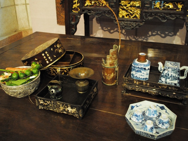 วัตถุสิ่งของโบราณกว่า ๑๐๐ ชิ้นที่จัดแสดงในงานไม่ว่าจะเป็นมีด ตะบันหมาก พานหมาก เต้าปูน กระโถนและตลับปูนที่มีโซ่เงินเล็กๆติดตรงกลางฝาตลับที่ทำจากวัสดุต่างๆด้วยรูปแบบที่แตกต่างกันทำให้ผู้เข้าชมสามารถจินตนาการภาพเกี่ยวกับประเพณีการกินหมากพลูในอดีต ภายในงานนิทรรศการยังจัดแสดงชุดเซี่ยนหมากของผู้ที่มียศฐาบรรดาศักดิ์เวียดนามราวศตวรรษที่ ๑๘ – ๑๙ ซึ่งทำจากวัสดุที่มีค่าต่างๆเช่น ทอง เงิน ไม้ที่หายากหรือเครื่องเคลือบดินเผาที่มีค่าหายาก ชุดเชี่ยนหมากเหล่านี้มีลวดลายแกะสลักอย่างประณีตสวยงามสร้างความประทับใจให้กับผู้เข้าชมจนอยากลองสัมผัสมือตามลวดลายเหล่านี้เพื่อที่จะรู้สึกถึงความงามของมัน มีเต้าปูนโบราณชิ้นหนึ่งที่ทำขึ้นตั้งแต่สมัยราชวงศ์หลีซึ่งถือว่ามีอายุเก่าแก่มากที่สุด โดยลวดลายธรรมดา หูจับถูกออกแบบเป็นรูปกุ้งหลังโค้ง มีก้ามยาวดูเหมือนกำลังโอบเต้าปูน แต่สิ่งที่สร้างความสวยงามที่โดดเด่นให้แก่เต้าปูนชิ้นนี้อยู่ตรงที่วัสดุนั่นคือ เครื่องเคลือบสีมรกตที่ขึ้นเงา ส่วนเต้าปูนของสมัยราชวงศ์เลและเหงวียนทำจากเครื่องเคลือบและมีเอกลักษณ์ที่แตกต่างกัน ทั้งนี้สะท้อนให้เห็นวัฒนธรรมการกินหมากพลูที่พัฒนาไปตามยุคสมัย ส่วนชุดเชี่ยนหมากของชนกลุ่มน้อยเผ่าต่างๆในเวียดนามไม่ว่าจะเป็นชนเผ่าจาม เขมร ไต่ โลโล เวินเกี่ยว เหมื่องและไทได้แสดงให้เห็นถึงความโดดเด่นของวัฒนธรรมการกินหมากพลูของแต่ละภูมิภาค บรรยากาศภายในงานมีความเป็นวัฒนธรรมการกินหมากพลูมากขึ้นด้วยการร้องเพลงพื้นเมืองกวานเหาะหรือเพลงร้องโต้ตอบกันของหนุ่มสาวเขตที่ราบลุ่มแม่น้ำแดง ซึ่งขับร้องโดยสาวๆในชุดเสื้อยาวโบราณโดยทั้งร้องทั้งเจียนหมากด้วย