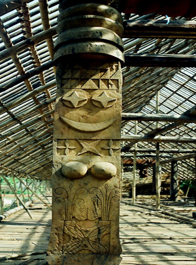 บนเสาบ้านหรือคานบ้านมักจะมีการแกะสลักลวดลายที่สะท้อนให้เห็นถึงชีวิตธรรมชาติอย่างมีชีวิตชีวาและการเชื่อมโยงระหว่างดินฟ้าอากาศและสิ่งมีชีวิตทั้งหลาย นั่นคือรูปแกะสลักหม้อหุงข้าว ครกตำข้าว เต่า นก พระจันทร์เสี้ยวเป็นต้น ดร.ลิวหุ่งเผยว่า“ลายแกะสลักเพื่อประดับบ้านของชาวเอเดได้เน้นที่เสาและคานบ้าน โดยนอกจากรูปพระจันทร์เสี้ยวและเต้านมของผู้หญิงที่บ่งบอกถึงอำนาจของผู้หญิงในครอบครัวแล้วก็มีรูปหม้อทองแดงที่เป็นสัญลักษณ์แห่งความร่ำรวยตลอดจนรูปสัตว์ต่างๆเช่น มังกร เต่า ปู หรือตัวเงินตัวทองเป็นต้น”