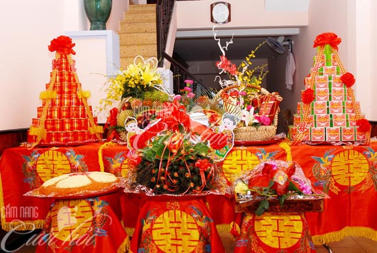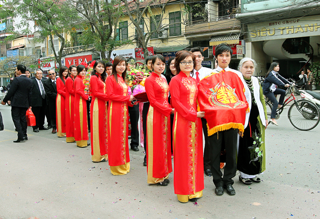 ตั้งแต่สมัยโบราณ ชาวเวียดได้ให้ความสำคัญต่องานใหญ่3อย่างที่ต้องทำคือ “ซื้อวัว มีครอบครัวและปลูกเรือน” ซึ่งนับเป็นสมบัติที่มีค่าที่สุดในชีวิต ดังนั้งการแต่งงานก็จะต้องได้รับการเตรียมพร้อมและจัดขึ้นตามขั้นตอนประเพณีโดยในสมัยก่อนจะมี6พิธีหลักคือพิธีVấn danhคือการพูดคุยทำความรู้จักกับฝ่ายหญิงว่าชื่ออะไร อายุเท่าไหร่ หน้าตาและบุคลิกภาพเป็นอย่างไร เป็นต้น เพราะในสมัยก่อนการคัดเลือกคู่ครองให้แก่ลูกเป็นหน้าที่ของพ่อแม่และผู้ใหญ่ -พิธีหนาบก๊่ต(Nạp cát)คือการสู่ขอ -พิธีหนาบท้าย(Nạp Thái) คือขั้นตอนต่อไปหลังจากได้หารือและตกลงกันแล้วเรื่องการแต่งงานซึ่งเหมือนวัฒนธรรมของจีนคือ ฝ่ายชายจะนำนกนางแอ่นสองตัวมามอบให้ฝ่ายหญิงเพื่อเป็นการยืนยันคำมั่นเพราะถือว่านกชนิดนี้เป็นสัญลักษณ์ของความซื่อสัตย์รักเดียวใจเดียว -พิธีหนาบเตะ(Nạp tệ) ก็คล้ายกับพิธีหนาบท้ายคือนำของขวัญที่มีค่ามามอบให้ฝ่ายหญิงเพื่อแสดงความจริงใจในการที่จะรับลูกสาวของเขามาเป็นสะใภ้ -พิธีถิงกี่ (Thỉnh kỳ) คือพิธีการตกลงกฤษ์แต่งงาน -พิธีงิงเทิน(Nghinh thân) คือพิธีแต่งงานรับเจ้าสาว แต่สมัยนี้เพื่อความสะดวกให้แก่ทั้งสองฝ่ายพิธีการต่างๆก็ถูกรวมเข้ากันให้เหลือเพียง3พิธีใหญ่คือ การทาบทามสู่ขอ งานหมั้น และงานแต่งงาน นางหวูทิแทงเติม นักวิจัยวัฒนธรรมเวียดนามแห่งพิพิธภัณฑ์ชาติพันธุ์เวียดนามเผยว่า ในพิธีทาบทามสู่ขอผู้ใหญ่ของทั้งสองฝ่ายจะหารือกันเพื่อทำความเข้าใจและตัดสินใจเรื่องการจัดงานแต่งงานให้แก่คู่หนุ่มสาว สิ่งของที่ฝ่ายชายจะนำมามอบเป็นของขวัญในวันนั้นอย่างแรกคือต้องมีขันหมากเล็กๆนอกนั้นก็แล้วแต่อาจจะมีถาดขนมนมเนยหรือผลไม้ด้วยและก็ไม่มีการกำหนดเวลาว่าจากวันสู่ขอถึงวันจัดงานหมั้นต้องห่างกันเท่าไหร่เพราะต้องขึ้นอยู่กับดวงชะตาของคู่บ่าวสาวด้วย โดยการดูฤกษ์แต่งงานก็ต้องเอาวันเดือนปีเกิดและเวลาตกฟากของฝ่ายหญิงมาคำนวณดวงชะตาตามแบบโหราศาสตร์และจะไม่แต่งงานในปีที่เป็นปีชงหรืออยู่ในเกณฑ์ปีกิมเลา(Kim Lâu)ที่มีเลข1-3-6-8