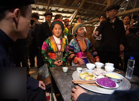 สำหรับการจัดงานแต่งงาน พิธีการรับเจ้าสาวเป็นขั้นตอนที่ชาวม้งให้ความสำคัญ โดยการจัดพิธีนี้จะมีขั้นตอนไม่มากแต่สามารถสะท้อนให้เห็นถึงความกตัญญูและความเคารพต่อบรรพชน เมื่อบ้านไหนมีคนแต่งงานก็จะต้องทำพิธีเซ่นไหว้เพื่อรายงานต่อบรรพบุรุษโดยเครื่องเซ่นมีแค่เนื้อสุกร1ชาม ข้าวสวยหนึ่งถ้วยและเหล้า1แก้ว ในพิธีเจ้าบ่าวกับเจ้าสาวจะใส่ชุดประจำชนเผ่า นายหว่างอามัวเผยว่า“เมื่อถึงบ้านภรรยา แม่ของแฟนก็ได้เตรียมชุดแต่งงานให้คู่รักเพื่อใส่ในระหว่างงาน เมื่อถึงบ้านสามีทางบ้านผมก็เตรียมอีกชุดไว้สำหรับเจ้าบ่าวเจ้าสาวเช่นกันโดยสองชุดจะมีความแตกต่างกันทั้งการออกแบบและสี ซึ่งของผู้ชายเป็นสีขาว ผู้หญิงเป็นสีดำ”