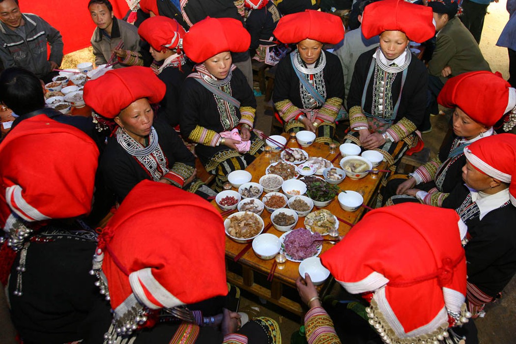ประเพณีการแต่งงานของชนเผ่าเย้าแดงที่ตำบลต๋าฝิ่น อ.ซาปา จ.ลาวกายนั้นก็ได้รับการปฏิบัติในหลายขั้นตอน โดยนับตั้งแต่ที่หนุ่มสาวสองบ้านได้พบกัน รักกันไปจนถึงวันตัดสินใจแต่งงานกันครอบครัวของทั้งสองฝ่ายได้พบปะสังสรรค์กันหลายครั้งและในการพบปะแต่ละครั้งนั้นก็จะมีการบรรเลงฆ้องและกลองเพื่อแสดงให้เห็นถึงการให้เกียรติต่อกัน