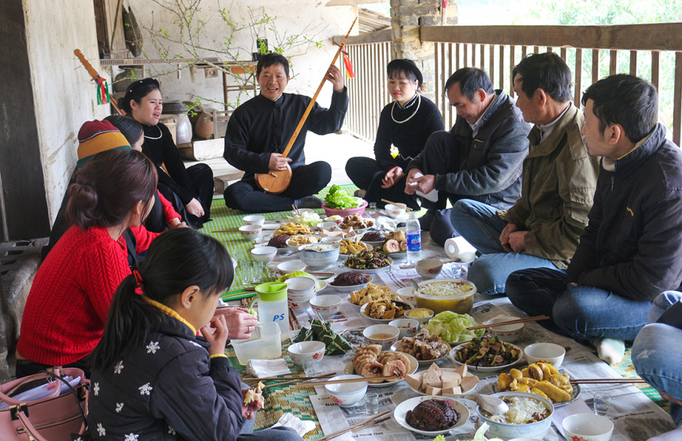 คุณป้า ลาถิห่งบอกว่าถาดอาหารเซ่นไหว้บรรพบุรุษในช่วงตรุษเต๊ตนั้นจะมีขนมข้าวต้มมัดใหญ่ซึ่งเป็นอาหารพิเศษที่ขาดไม่ได้ ดังนั้นในวันที่ 25 หรือ 26 เดือน 12 ตามจันทรคติ คุณป้าและสมาชิกในครอบครัวจะช่วยกันล้างใบตอง เตรียมเนื้อหมูและข้าวเหนียวเพื่อห่อขนมข้าวต้มมัดใหญ่ โดยห่อแบบรูปทรงกระบอก เรียกว่า “ขนมพ่อ” และ “ขนมแม่” ที่มีใส้เป็นไข่ไก่และปลา ซึ่งมีแต่ผู้ใหญ่ที่มีประสบการณ์เท่านั้นสามารถห่อขนมชนิดนี้ได้ นอกจากนี้ยังมีห่อขนม “ก๊อกหม่อ” ขนาดเล็กๆไว้แจกให้เด็กๆด้วยคุณป้าบอกว่า “ถาดอาหารเซ่นไหว้บรรพบุรุษของครอบครัวในวันส่งท้ายปีเก่าต้อนรับปีใหม่ มักจะมีเนื้อหมู เหล้าอุ ขนมข้าวต้มมัดใหญ่และไก่ลวก 1 ตัว ลูกหลานจะกลับมาชุมนุมกันอย่างพร้อมหน้าพร้อมตา ทำให้ป้ามีความสุขมาก”
