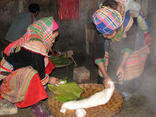 ครอบครัวของนาย หย่างอาเกอที่อ.เวินโห่ จังหวัดเซินลากำลังเตรียมฉลองตรุษเต๊ตปีใหม่ โดยผู้ชายทำความสะอาด ตกแต่งบ้าน ส่วนผู้หญิงเตรียมข้าวของเพื่อทำอาหาร ซึ่งเนื่องจากอาศัยในเขตเขาสูงดังนั้นชาวม้งได้ประกอบอาชีพเกษตรกรรมเป็นหลัก ปลูกพืชเลี้ยงสัตว์ไว้กินเองดังนั้นข้าวปลาอาหารต่างๆส่วนใหญ่จึงไม่ต้องไปซื้อ นายหย่างอาเกอ เผยว่า“ชาวม้งเตรียมต้อนรับตรุษเต๊ตตั้งแต่ต้นปี โดยมักจะมีไก่ หมูและขนมแบ๊งใหญ่สำหรับเด็กๆ ซึ่งอาหารในวันตรุษเต๊ตนั้นจะต้องเป็นหมู1ตัวและไก่สองตัว หลังตรุษเต๊ตก็จะเตรียมใหม่ให้แก่ปีหน้า”