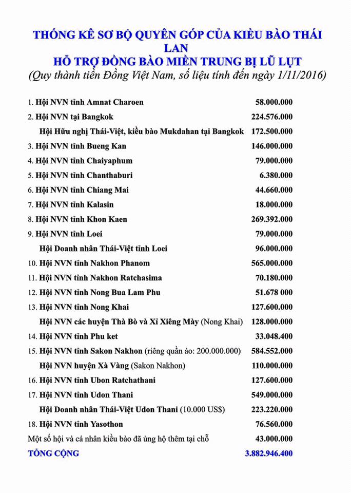 ![]() ตามข้อมูลของสถานทูตเวียดนามประจำประเทศไทย จนถึงวันที่ 1 พฤศจิกายนปี 2016 ชาวเวียดนามในประเทศไทยได้บริจาคเงินเกือบ 3.9 พันล้านด่ง